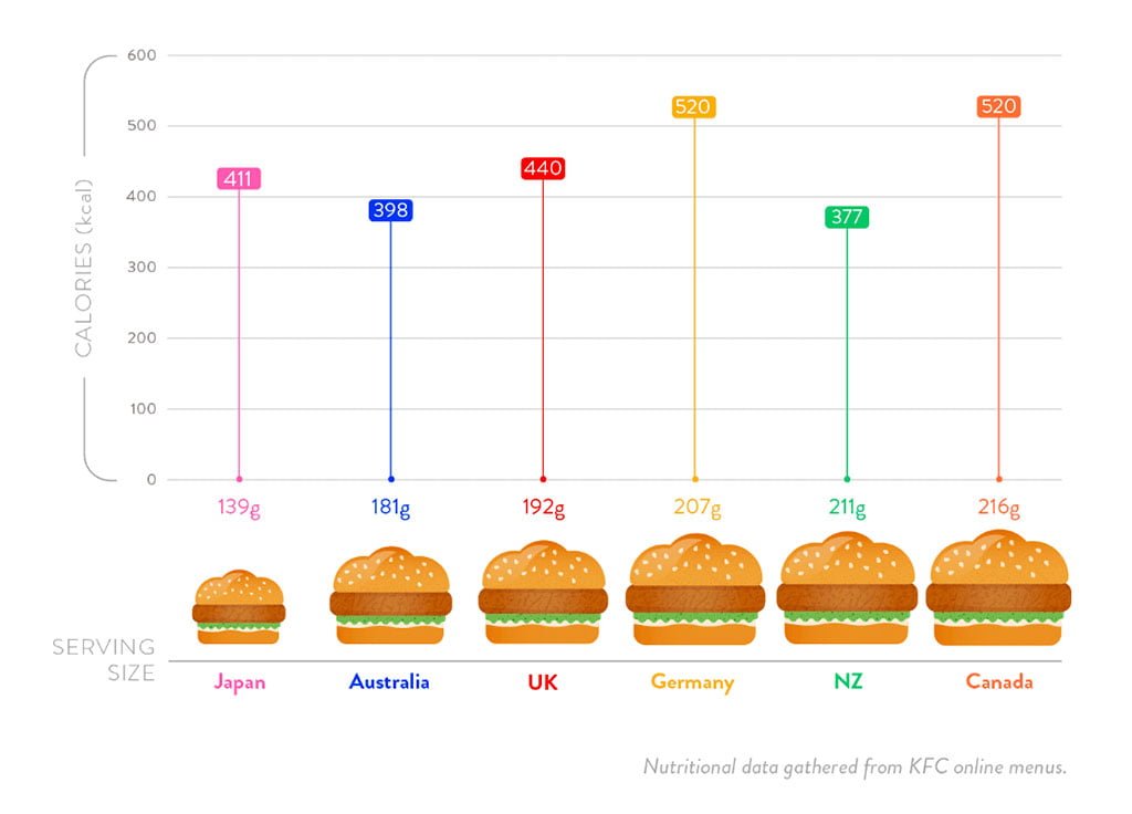 Variações do mesmo tema: tamanho e calorias de sanduíche KFC em diferentes países