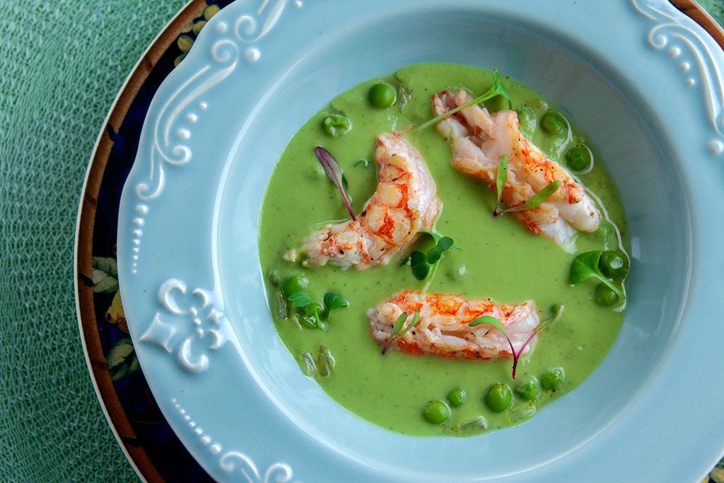 Quando se diz que precisamos comer mais pescados, lembre que valem também os frutos do mar. Neste caso, que tal unir sabor e leveza com esse creme de ervilhas com lagostins?