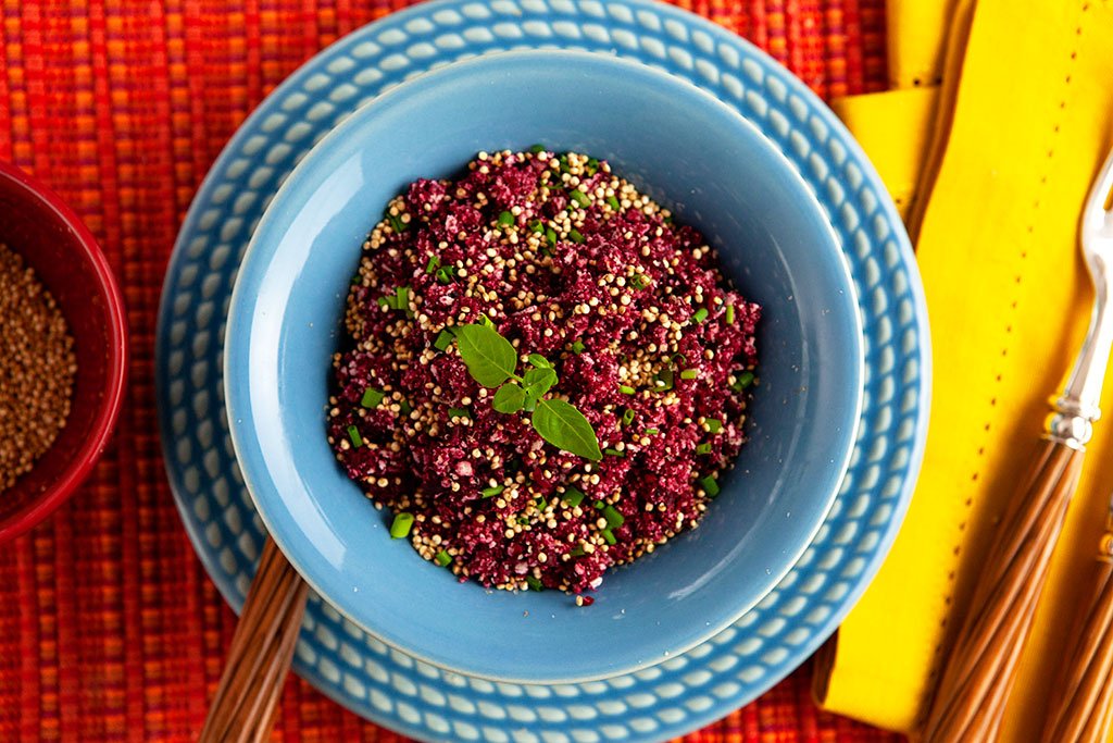 Farofa de beterraba com pipoca de quinoa
